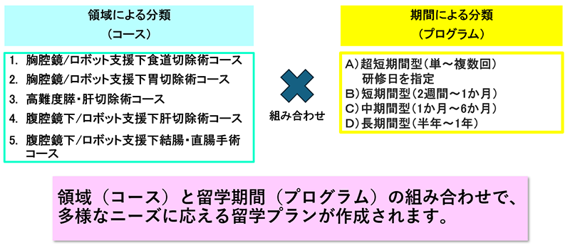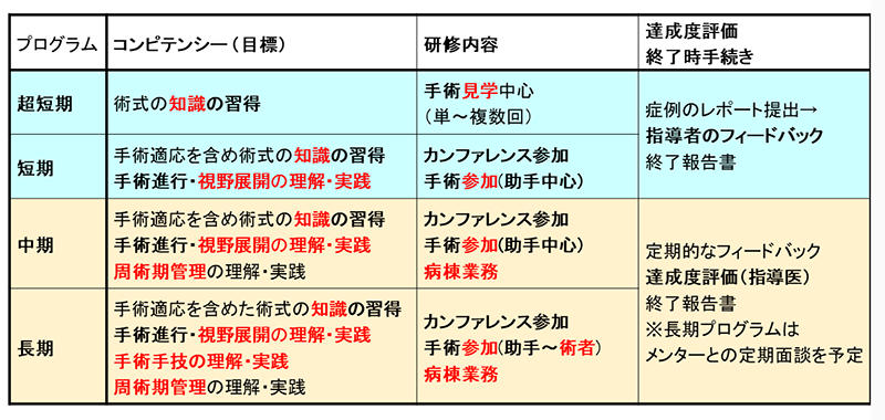 プログラムは、超短期から長期に至るまで多様な選択肢を用意し、食道、胃、肝胆膵、大腸といった幅広い領域をカバーしています。見学から助手、さらに執刀に至るまで段階的に経験を積み、自施設に還元できるよう設計しました。また、女性医師や地域枠など、多様性に配慮した制度設計とし、将来にわたり持続可能なキャリア形成を支える仕組みとしています
