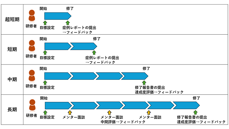 研修期間の長さ別に、超短期(見学型)・短期(2週間~1か月)・中期(1か月~6か月)・長期(6か月~1年)の4種類の研修プログラムがあります。