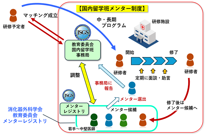 中期・長期型プログラムの研修者には1名ずつメンターを配置します。メンターは留学先以外の施設から選出され、日本消化器外科学会 教育委員会が管理する「メンターレジストリ」に所属する、同専門分野の若手〜中堅医師が担当します。 - 面談と報告